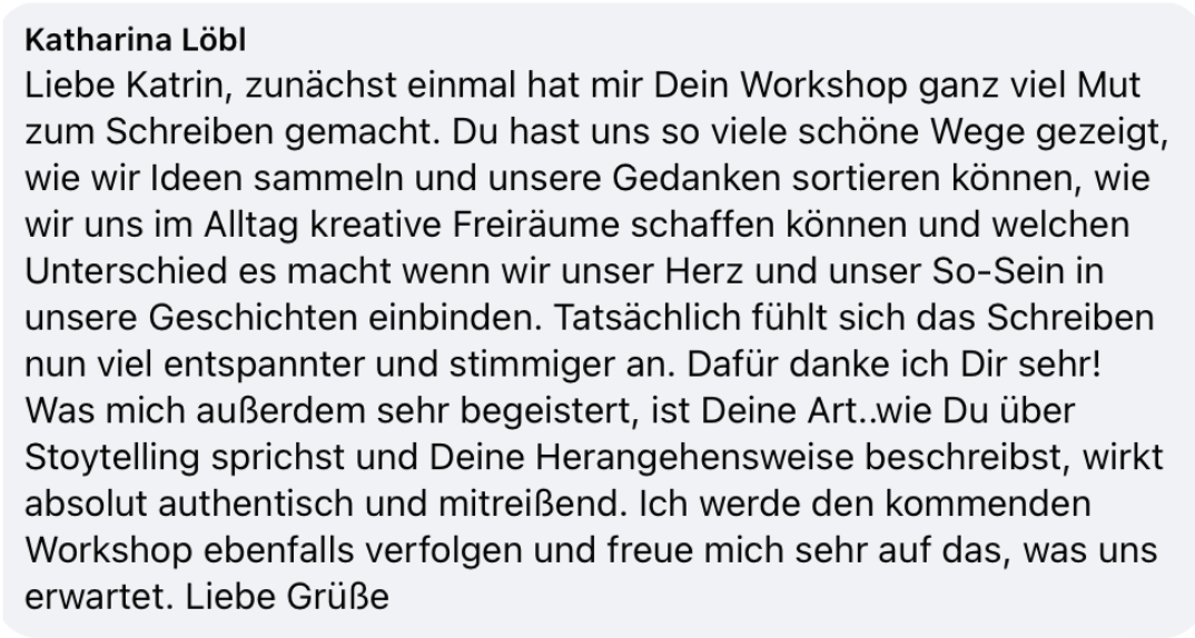 "Katinka ist für mich nicht nur hervorragend strukturiert, sondern auch eine leidenschaftliche Storytellerin, die immer mit vollem Herzen dabei ist. Ihre Fähigkeit, einen mitzureißen und weiterzuhelfen, wenn man nicht weiterkommt, ist einfach beeindruckend. Ich kann Katinkas Seminare jedem empfehlen, der Lust hat, über seine eigene Geschichte zu schreiben und vielleicht nicht genau weiß, wie er anfangen soll – denn Katinka versteht es, dies auf eine inspirierende Weise zu vermitteln."